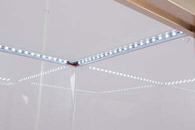 普通玻璃,超白玻璃 | 鋁制磨砂閃銀燈槽,超白玻璃無影膠無縫粘貼 | LED嵌入燈槽內,槽內安全裝電線卡拉,電線不外露安全美觀 |